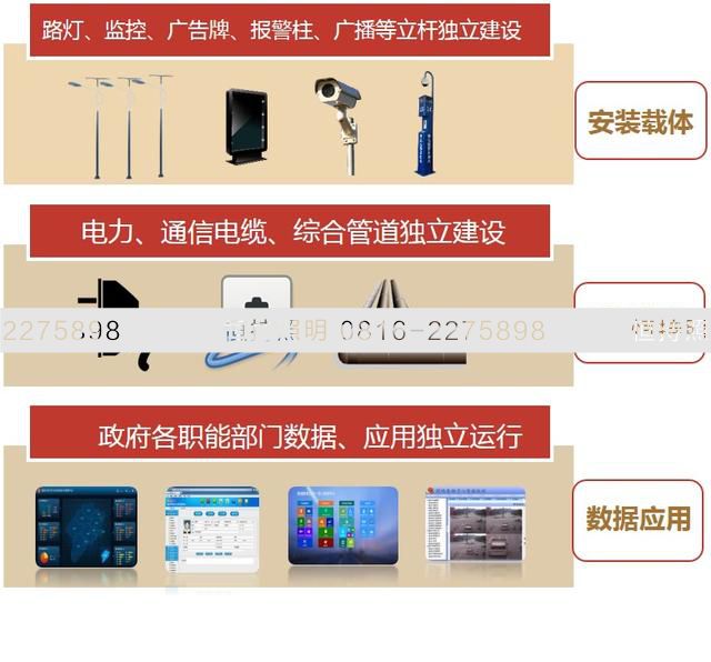 市政工程庞大臃肿,重复建设率高,反映出当前的城市管理水平不高,市政建设的成本高、周期长,资源浪费,造成信息孤岛。路灯、监控、广告牌、报警柱、广播等立杆独立建设;电力、通信电缆、综合管道独立建设;政府各职能部门数据、应用独立运行。